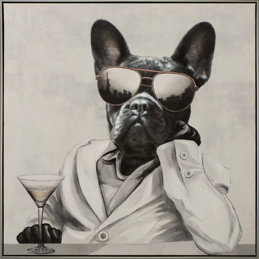 Stylish dogs for all lovers of the Cosa Nostra. Hand-finished with attention to detail right down to the tips of the hair. The New York skyline including the Statue of Liberty is reflected in the lenses of the sunglasses. Elegant silk finish in the silver-coloured shadow gap frame rounds off our image in a striking way. High-quality Giclée with elaborate hand painting. An exclusive decoration for your home or with statement character for your business premises.