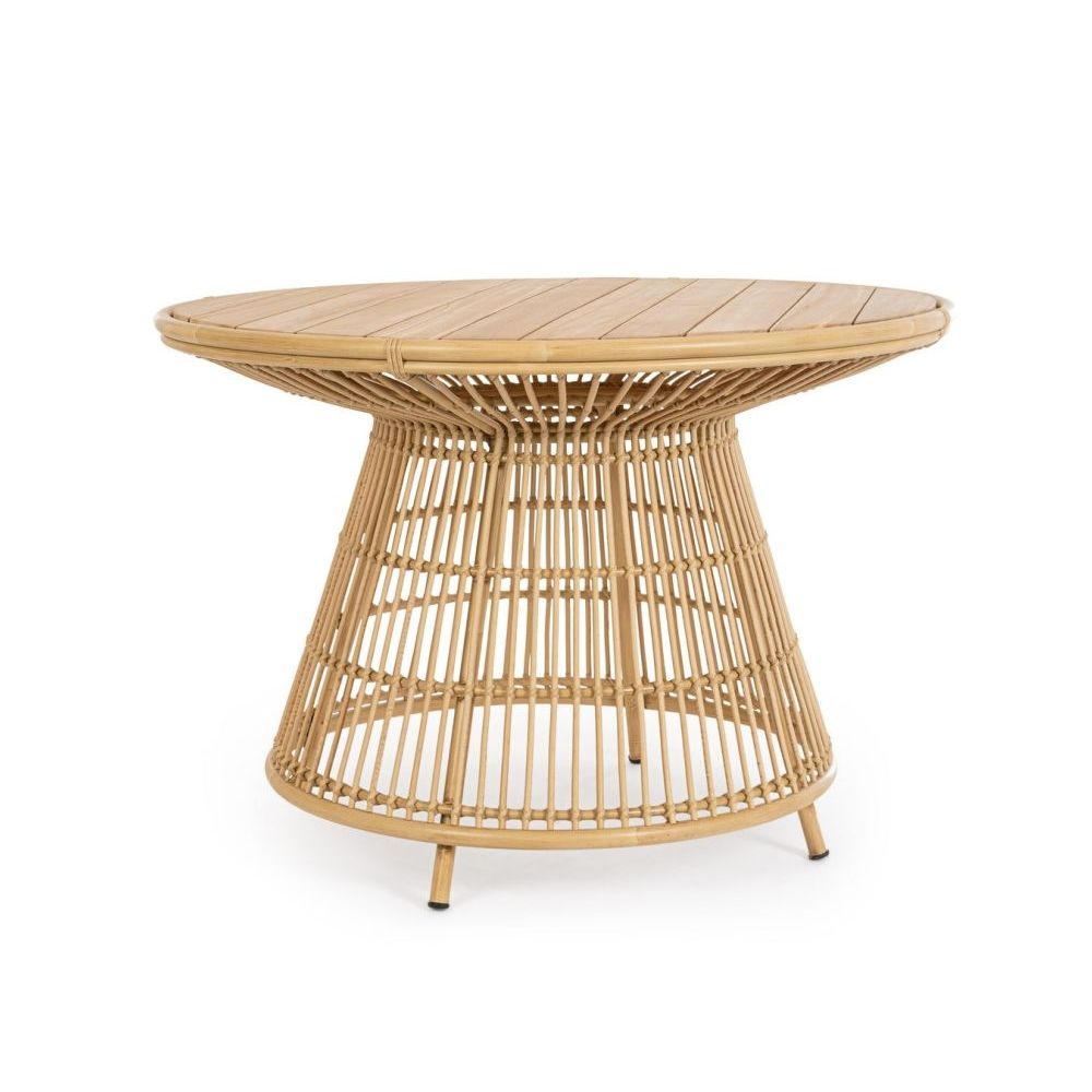 ALUMINIUM FRAME POWDER COATED (POLYESTER) WITH RATTAN EFFECT, SYNTHETIC FIBER WEAVING (ROUND 10MM). TOP IN TEAK - SVLK (INDONESIAN LEGAL WOOD), WITH NATURAL FINISHING.