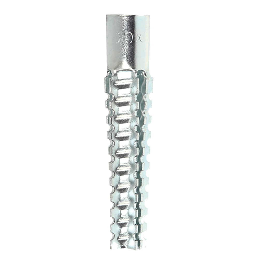 Universal hammer-in anchor is made of carbon steel with protective zinc coating. The anchor is used as a body for screw-in elements, such as screws, screw-in hooks. Metal anchor has ribbed design which provides easy screw tightening, and outer teeth allow for transfer of heavy loads. Fixing is executed by driving the screw into the anchor which causes its expansion and creates a permanent anchorage.