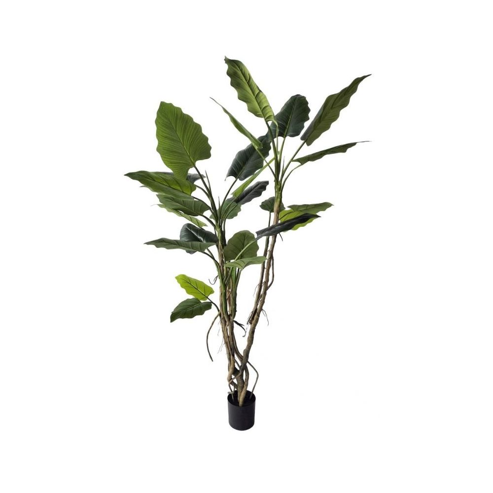 RUBBER LEAVES, POLYURETHANE TRUNK, METAL, PLASTIC VASE, CONCRETE VASE CONTENTS.