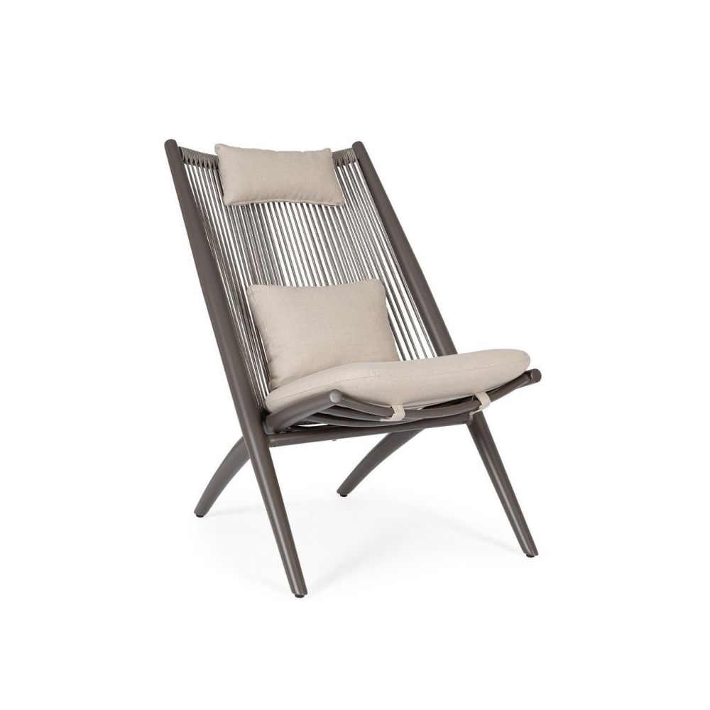ALUMINIUM FRAME POWDER COATED (POLYESTER), WEAVING WITH POLYESTER STRAP TREATED (WATER REPELLANT AND UV RESISTANT). REMOVABLE CUSHIONS COVER IN POLYESTER (280GR/M2). TO BE ASSEMBLED.
