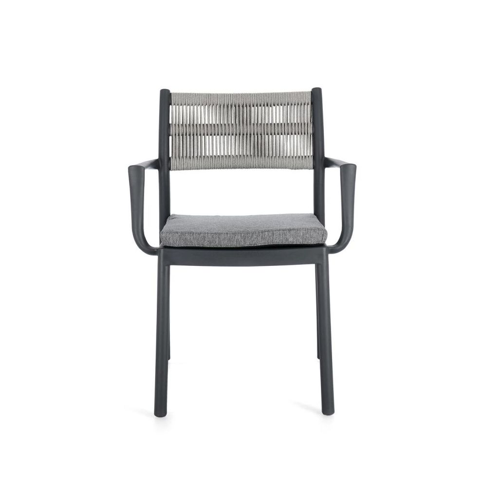 POLYPROPYLENE (PP), UV RESISTANT. BACKREST WITH WOVEN POLYESTER CORD. SEAT CUSHION REMOVABLE WITH WATER REPELLENT POLYESTER FABRIC. STACKABLE