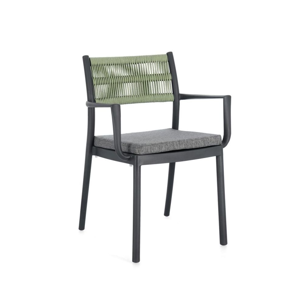 POLYPROPYLENE (PP), UV RESISTANT. BACKREST WITH WOVEN POLYESTER CORD. SEAT CUSHION REMOVABLE WITH WATER REPELLENT POLYESTER FABRIC. STACKABLE