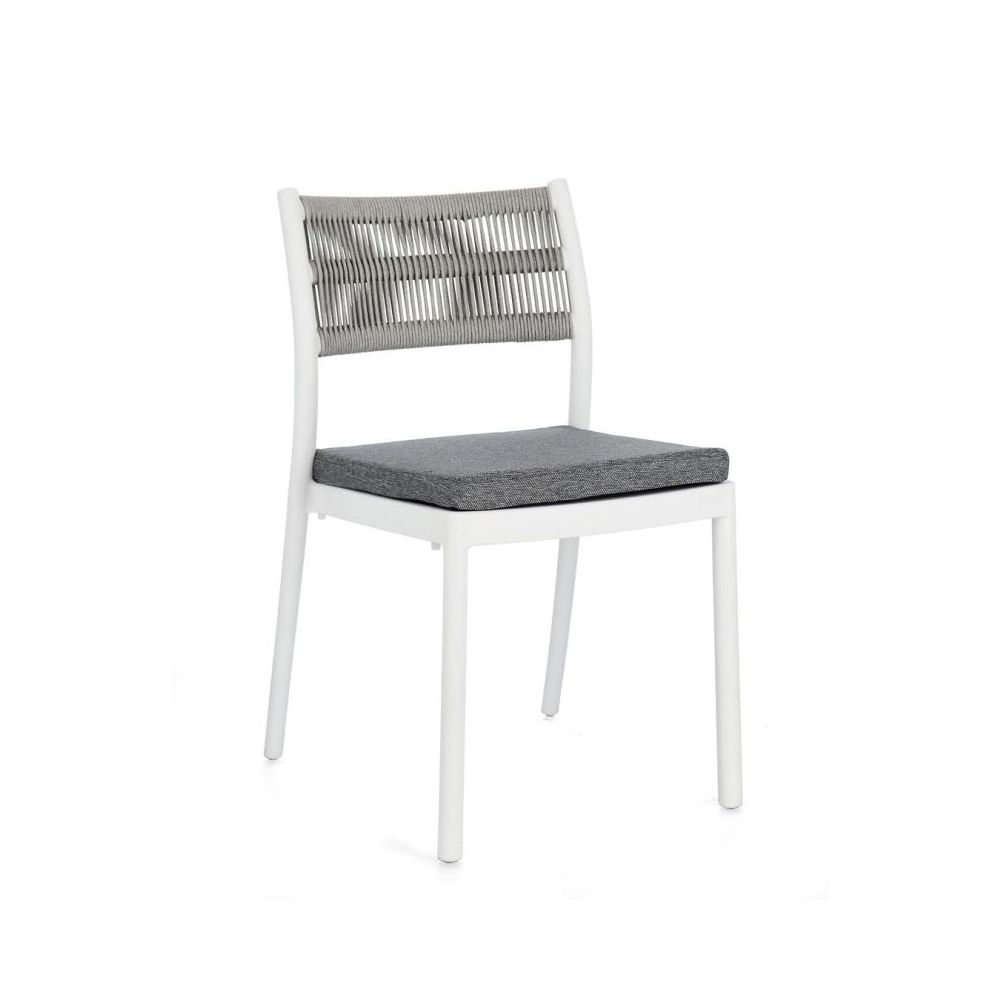 POLYPROPYLENE (PP), UV RESISTANT. BACKREST WITH WOVEN POLYESTER CORD. SEAT CUSHION REMOVABLE WITH WATER REPELLENT POLYESTER FABRIC. STACKABLE