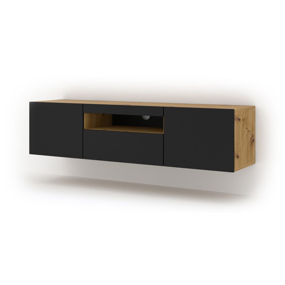 Universal TV cabinet, ideal for the living room or youth room. The cabinet is universal – it can be hung on the wall or stand on the floor (it includes plinths that can be optionally mounted). Designed in a modern style, it features one open shelf (for set-top boxes or consoles) and three lockable compartments (two opening to the sides and one opening downwards).