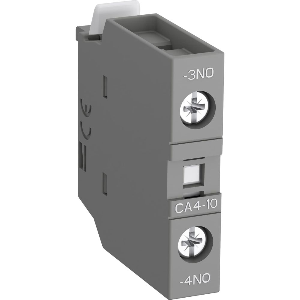 CA4-10 is a 1-pole front mounted auxiliary contact block equipped with screw terminals and can be fitted on AF(C)09(Z)(B)...96 contactors and NF(C)(Z)(B) contactor relays. CA4-10 is available with 1 N.O. instantaneous contacts for standard industrial environments.