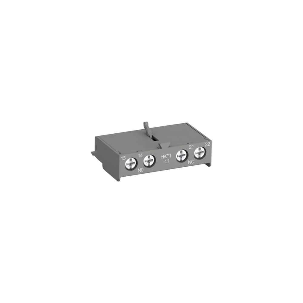 Auxiliary contacts HKF1 with screw terminals change position with the main contacts of the manual motor starter. They are mounted on the front side of manual motor starters MS116, MS132 or MS165. Auxiliary contacts HKF1 are available as normally open or normally closed contacts.