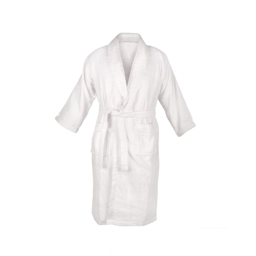 White cotton bathrobe with shawl collar, "hotel" type. Soft with high density and excellent absorbency.