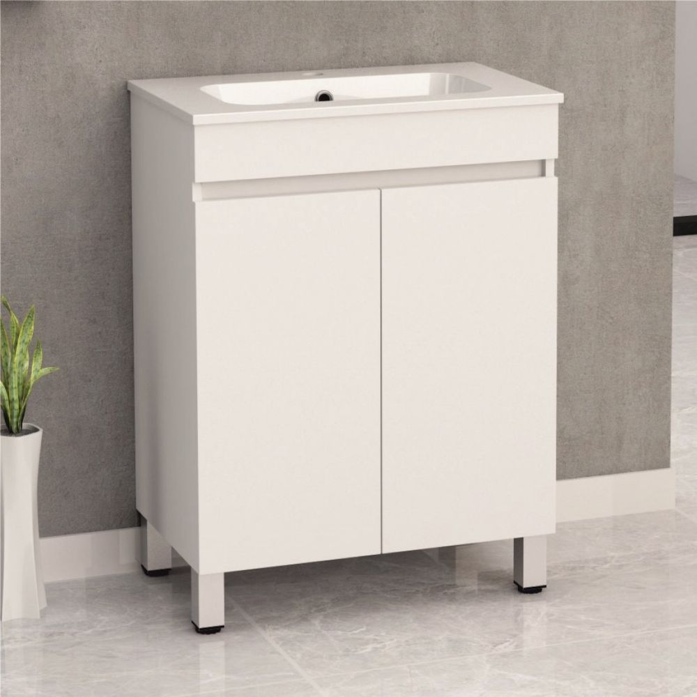 Bath room cabinet with 2 doors Material: PVC Back board: 5mm, the others 15mm DTC hinge with soft-closing Aluminium adjustable leg 10cm hight Without shelf Painted 2 sides and front KD package RESIN BASIN EE604 + PLASTIC OVERFLOW KITS