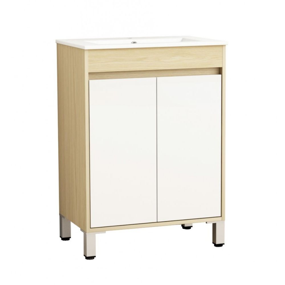 Standing bathroom cabinet with 2 doors, 15 mm PVC with glossy white lacquer, 5 mm PVC for back board, wooden decorations PS045, DTC hinge with soft-closing, plastic legs 10 cm high, screws for fix on the wall, ceramic basin 8860NEW