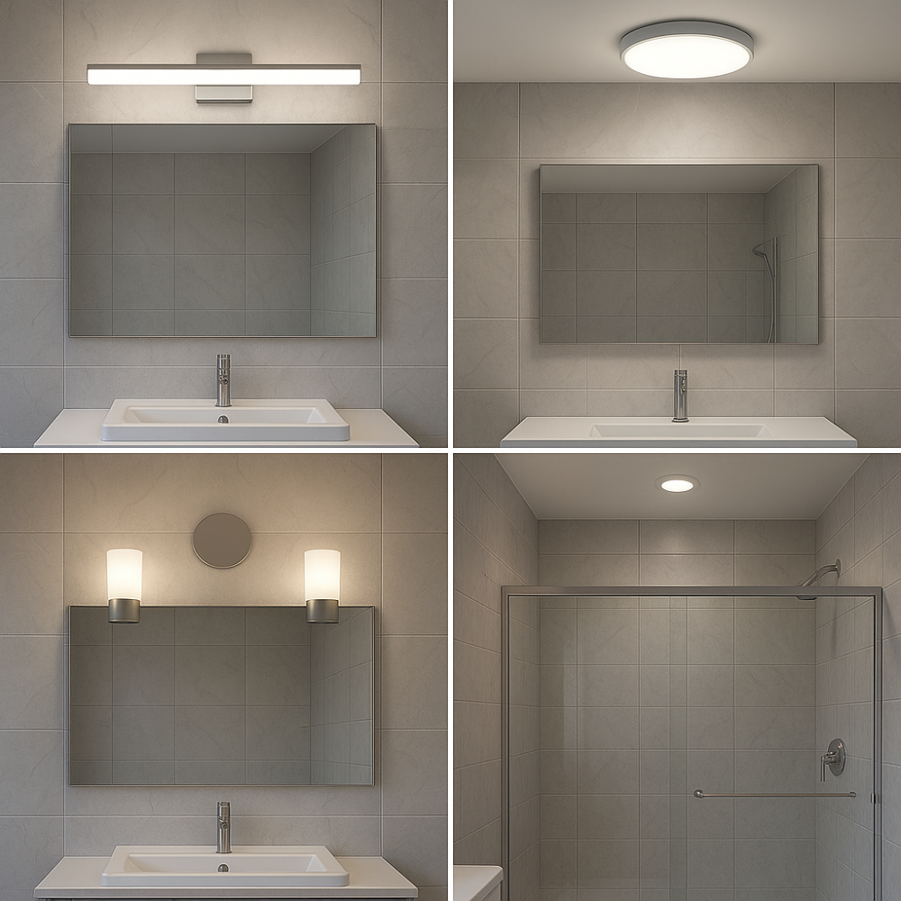 Разнообразието от осветителни тела може да бъде объркващо. Съществуват множество варианти, които могат да отговорят на различни нужди и предпочитания в интериора на банята. Основните видове, използвани в този тип помещения, са: