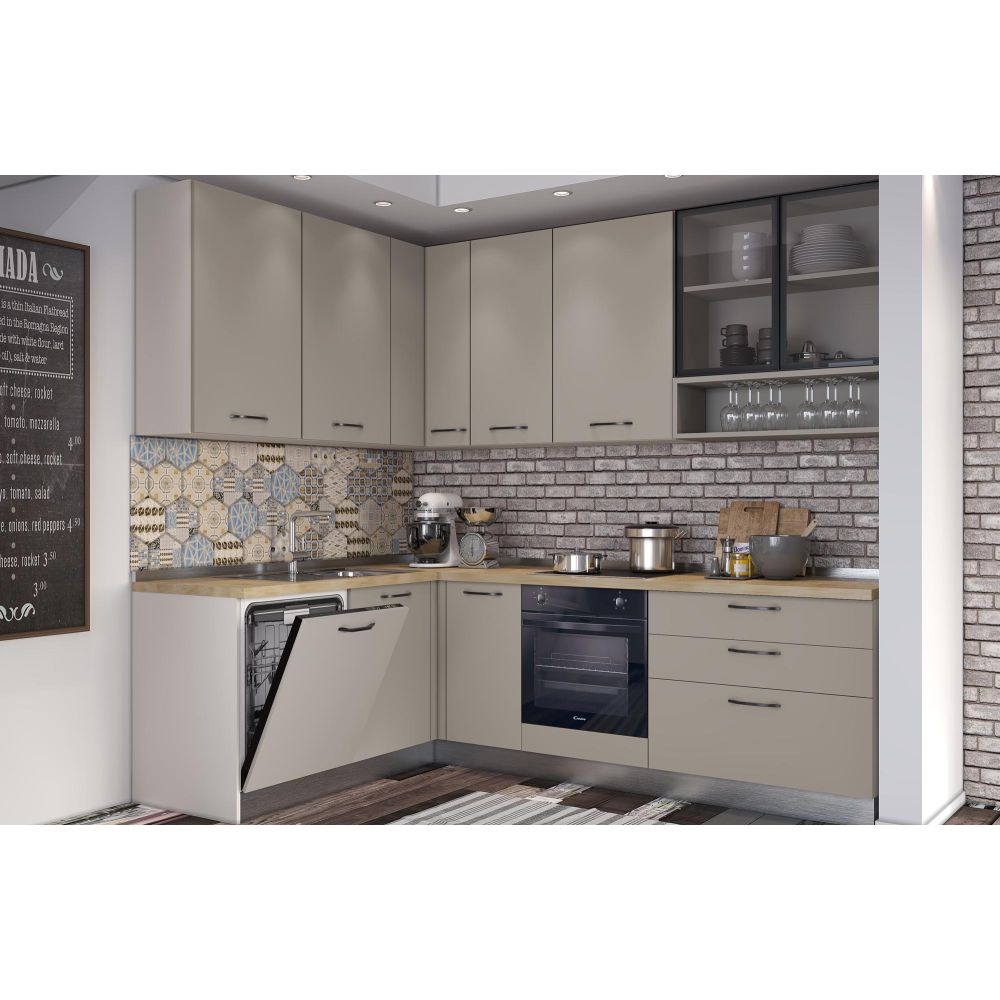 Corner kitchen VANIA, 187x260 cm, basalt fronts, cadiz oak worktop and cashmere wall panel