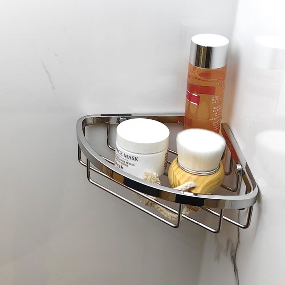 Polished triangular stainless steel shelf. Rust-resistant, easy to clean.