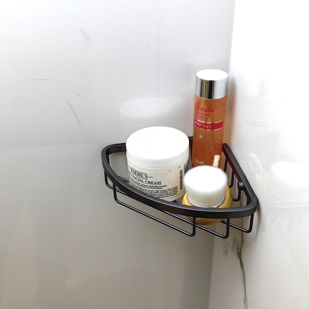 Triangular bathroom wire basket in graphite gray with matte PVD coating. Ideal for industrial or rustic style.