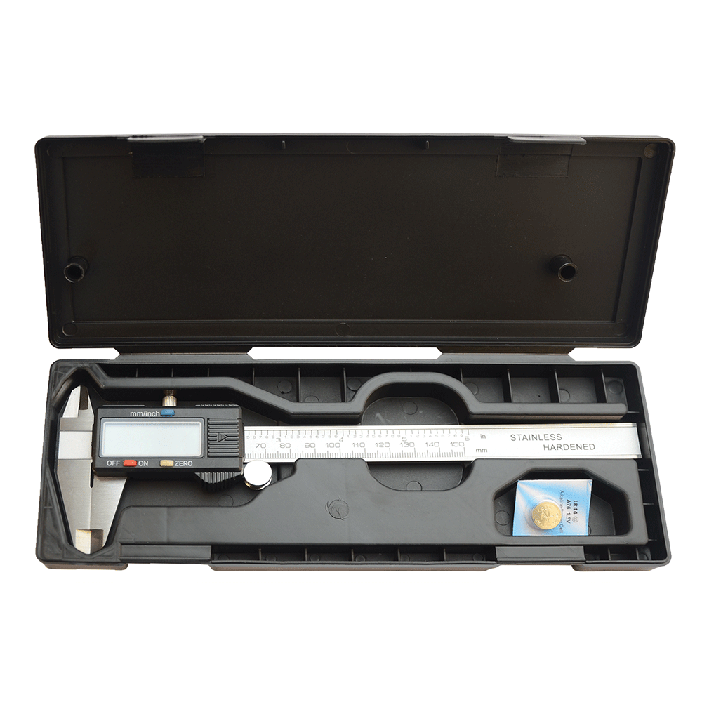 DIGITAL CALIPER Made of hardened aluminum with measurement options for internal, external, depth, and step dimensions. Features an LCD display and includes a 1.5V battery.