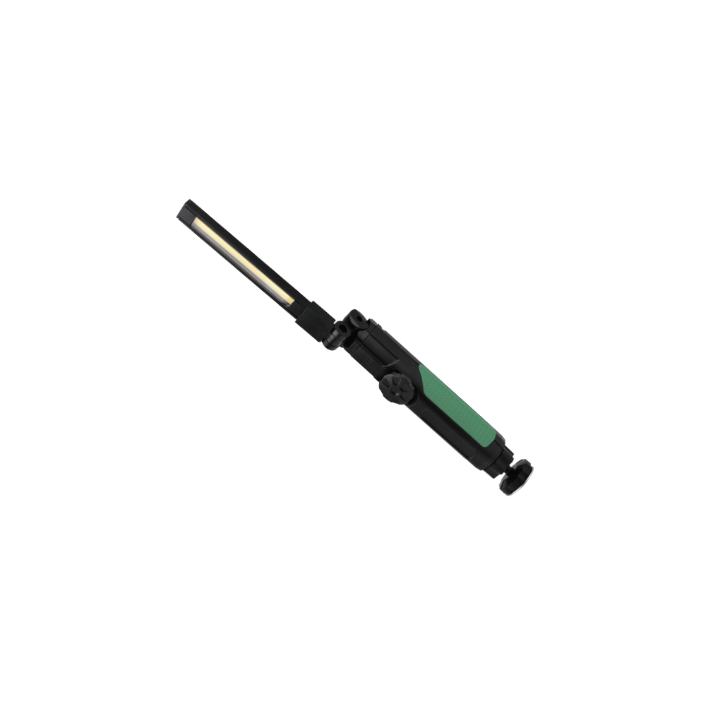LED COB work lamp model E-2302 with 7W power, featuring 1xCOB and 1xXPE LED chips. Offers stepless dimming for precise brightness control. Powered by an 1800mAh lithium battery, providing up to 2.5 hours of use and approximately 3 hours of charging. Made of durable ABS material, with dimensions 36x36x395 mm and a weight of 200 g. Includes a 1m Type-C charging cable.