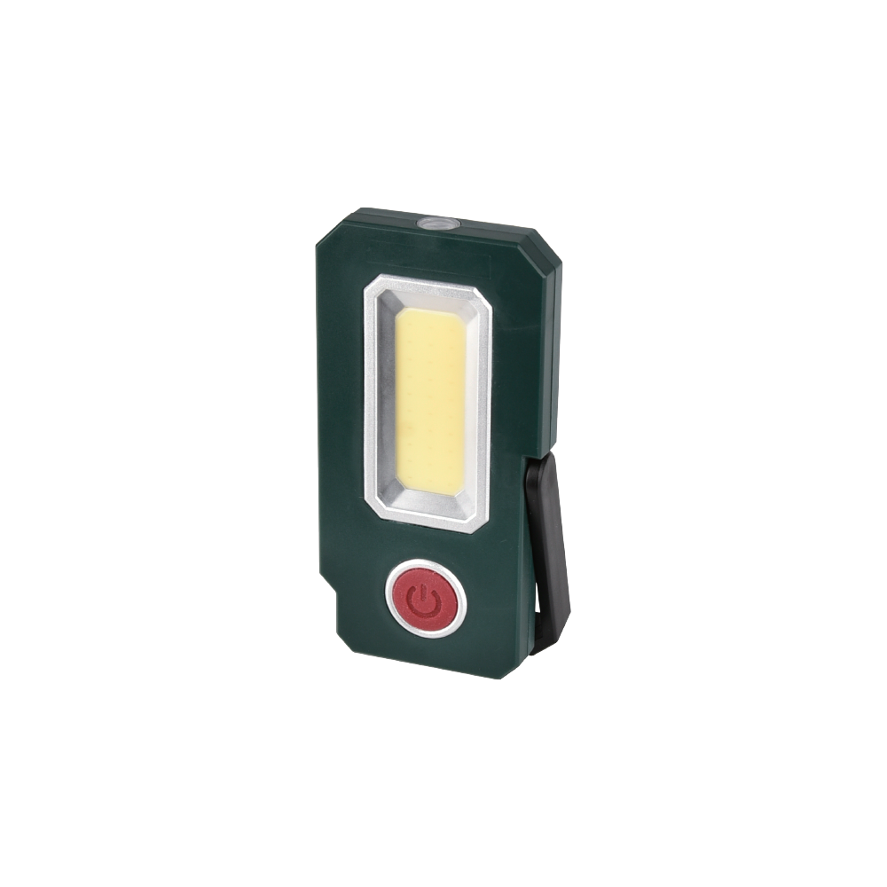 LED COB work lamp model E-2305 with 5W power and 400 lumens brightness (±10%), equipped with 1xCOB and 1xXPE LED chips. Offers 4 functions: COB 100%, COB 50%, LED 100%, and Off. Powered by a 2000mAh polymer lithium battery, providing up to 2.5 hours of operation and approximately 3 hours charging time. Made of durable ABS material, with a size of 15x64x131 mm and weight of 114 g. Includes a 0.5m Type-C charging cable.