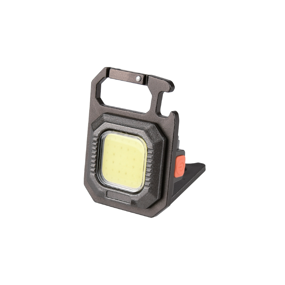 Compact LED COB work lamp model E-3002 with 5W power and 400 lumens brightness. Features a COB LED chip and 6500K color temperature. Offers four modes: High, Medium, Strobe, and Off. Hold for 2 seconds to activate the highlight mode. Powered by a 500mAh polymer lithium battery, with 1-hour charging time and up to 3 hours of use. Made of ABS, PS, and aluminum, with dimensions of 60x40x20.4 mm and weight of 45 g. Includes a 15 cm Type-C cable.