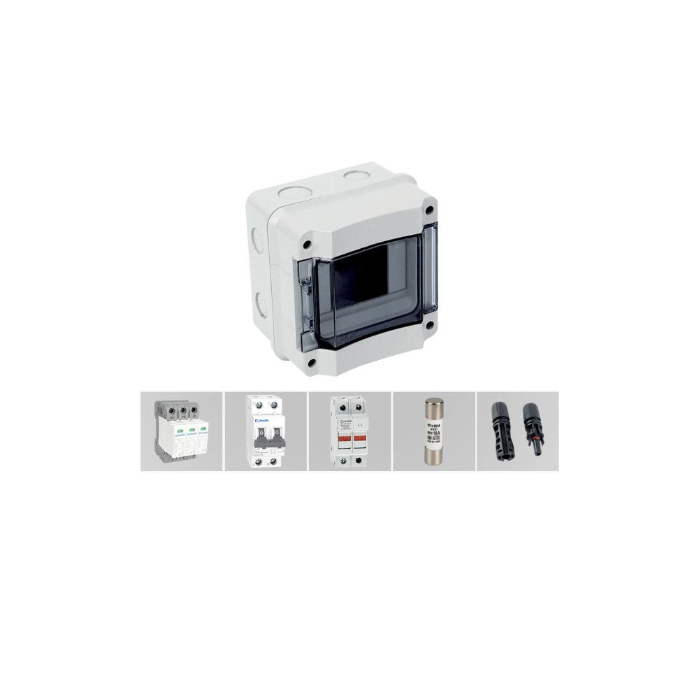 THЕ SET INCLUDES • ABS enclosure IP65: 1 x 60003 • SPD 2P type 2 1000V DC: 2 x 64210 • MCB 2P 20A 500V curve C: 2 x 41268 • Swich disconnector 2P 32A: 2 x 10RT1832 • Fuse links 20A: 4 x 10G103820 • MC4 connectors 1500V 4-6mm2 male/fimale8 x 411079/MF