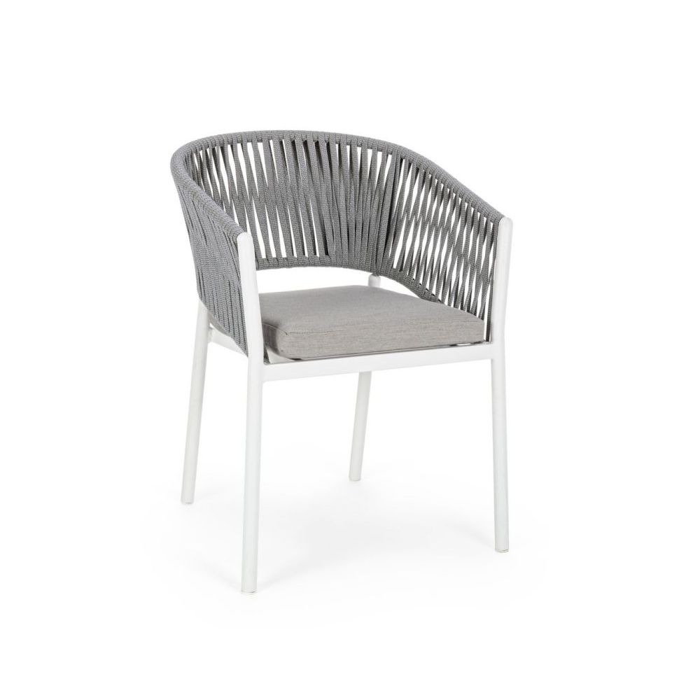 ALUMINIUM FRAME, POWDER COATED (POLYESTER). WEAVING IN TETORON ROPE (100% POLYESTER). SEAT CUSHION WITH REMOVABLE COVER IN WATER REPELLENT OLEFIN FABRIC (100% POLYPROPYLENE). STACKABLE.