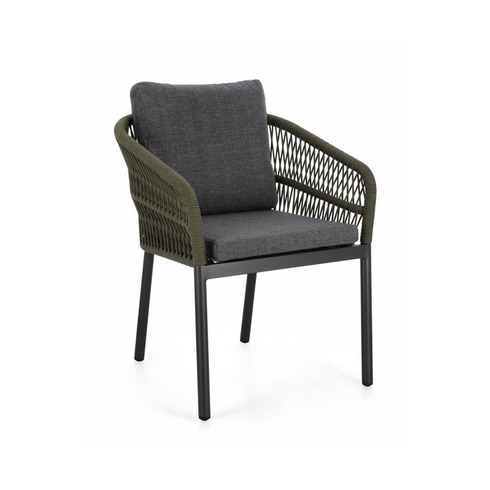STRUCTURE IN POWDER-COATED ALUMINIUM (POLYESTER). WEAVING FOR OUTDOOR USE IN OLEFIN ROPE (POLYPROPYLENE). REMOVABLE CUSHIONS IN 100% WATER-REPELLENT POLYPROYLENE. STACKABLE.