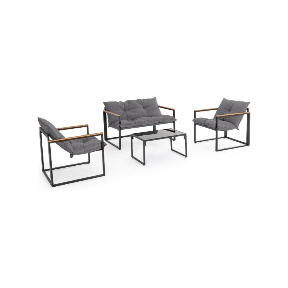 The structure is made of steel treated for outdoor use through phosphating and powder-coated (polyester) in anthracite color while the armrests have inserts in polywood, a composite material with a similar appearance to wood. Seat and backrest are in 2x1 textilene with non-removable cushions in dark gray water-repellent polyester fabric.