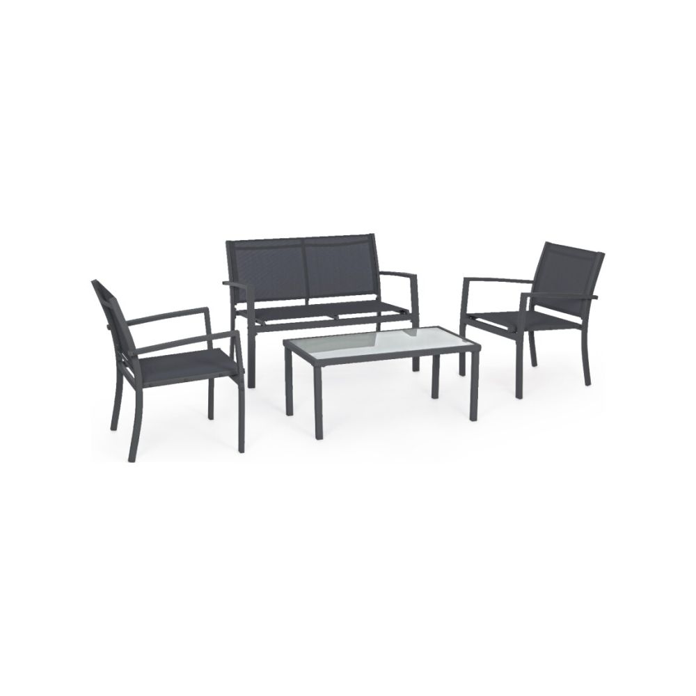 The structure of the sofa and armchairs is in anthracite-colored painted steel and seat in anthracite-colored textilene.