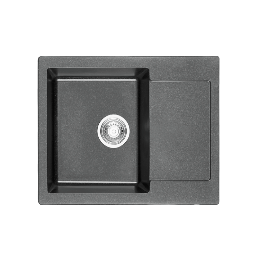 Countertop sink in grey color. It is made of high-quality granite composite, resistant to scratches, high temperatures, and daily use. Comes complete with a strainer, siphon, clip, fixing set.