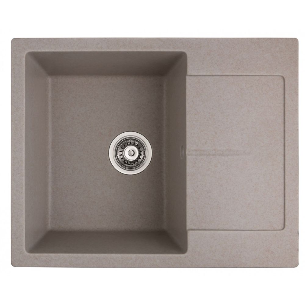 Countertop sink in sand color. It is made of high-quality granite composite, resistant to scratches, high temperatures, and daily use. Comes complete with a strainer, siphon, clip, fixing set.