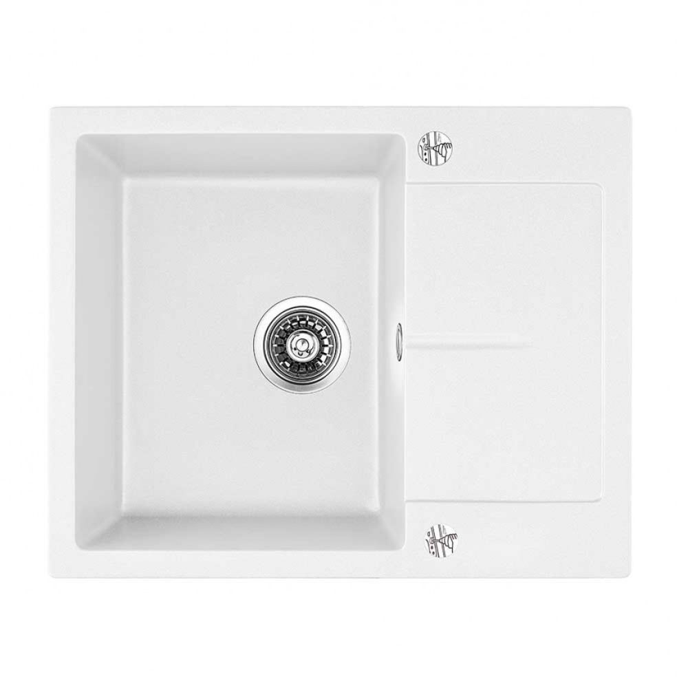 Countertop sink in white color. It is made of high-quality granite composite, resistant to scratches, high temperatures, and daily use. Comes complete with a strainer, siphon, clip, fixing set.