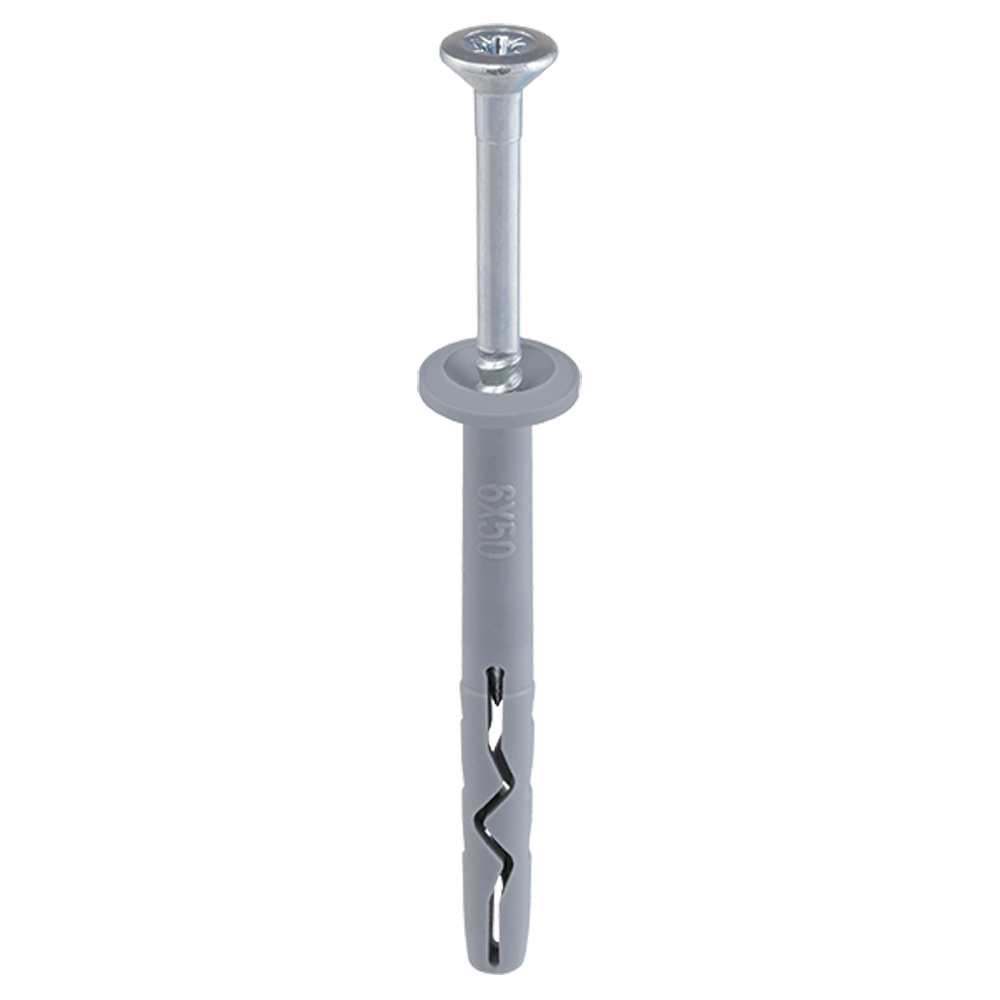 Hammer drive plug comprises a polyethylene and a countersunk head screw made of electroplated coatings or non-electrolytically applied zinc flake coatings steel. It is designed for fixing of thin-walled steel members. Increased head diameter ensures much better holding power of the elements being installed, and countersunk section provides reliable installation and eliminates damage to the screw when driving.