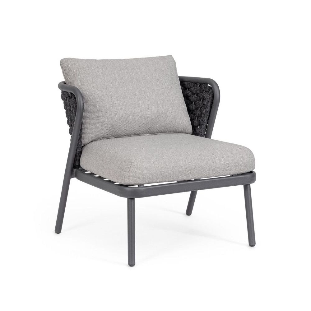 ALUMINIUM FRAME POWDER COATED (POLYESTER). TEXTILENE ROPE WEAVING WITH NITRILIC RUBBER FILLING. SEAT CUSHION WITH REMOVABLE COVER IN OLEFIN WATER REPELLENT FABRIC (100% POLYPROPYLENE). .