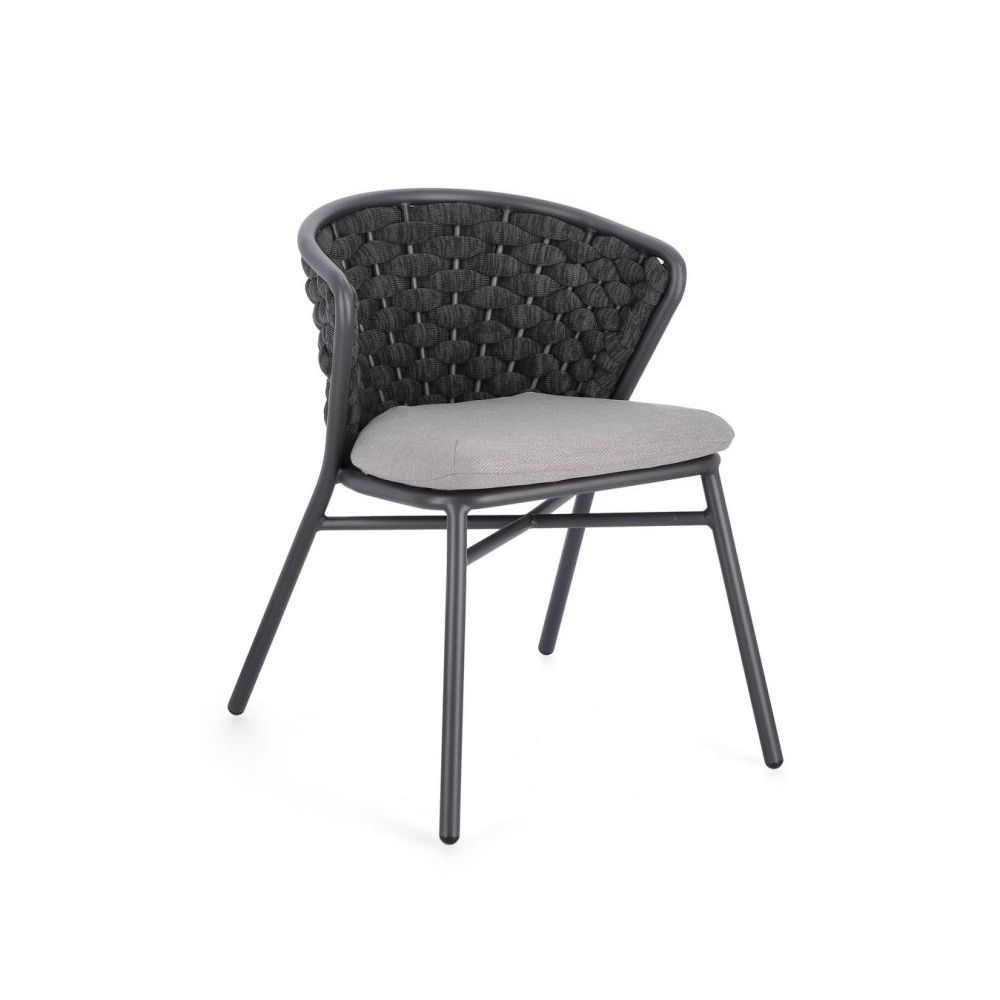 ALUMINIUM FRAME POWDER COATED (POLYESTER). TEXTILENE ROPE WEAVING WITH NITRILIC RUBBER FILLING. SEAT CUSHION WITH REMOVABLE COVER IN OLEFIN FABRIC (100% POLYPROPYLENE). STACKABLE.