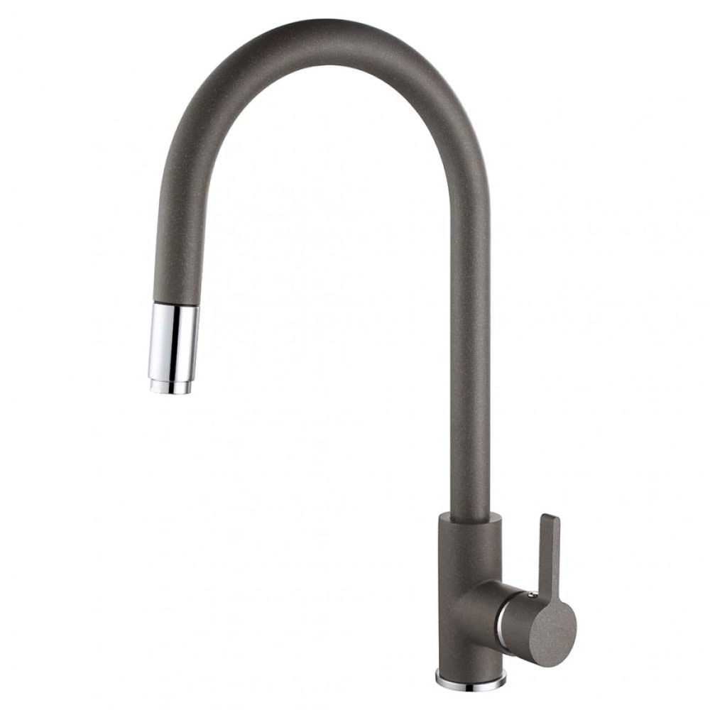 Single-lever stainless steel kitchen mixer in grey granite color with pull-out spout, with Sedal 35 mm ceramic mechanism, one 1.5 m nylon hose, flexible hoses 3/8*40 cm made of stainless steel SS201 and installation kit.