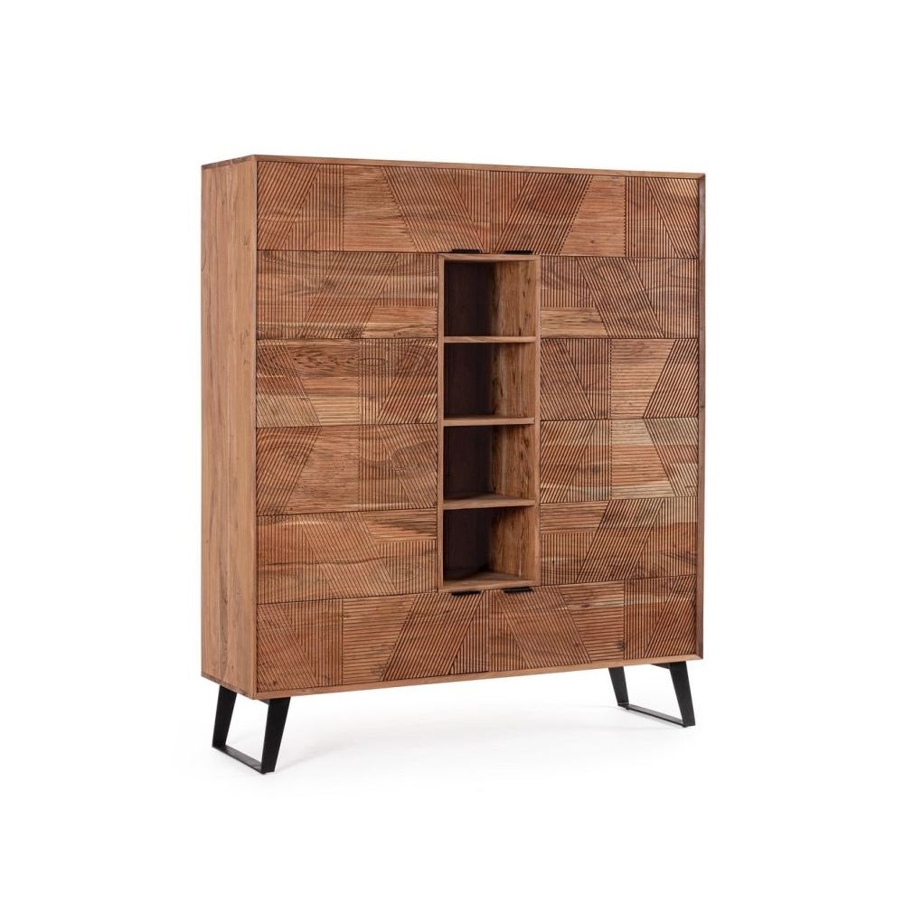 ACACIA WOOD FRAME, BACK PANELS AND BOTTOM OF DRAWERS IN PLYWOOD. FRONT OFDOORS AND DRAWERS INLAID AND HANDMADE. PROTECTIVE ACRYLIC FINISH. STEEL HANDLES AND LEGS. LEGS TO BE ASSEMBLED.