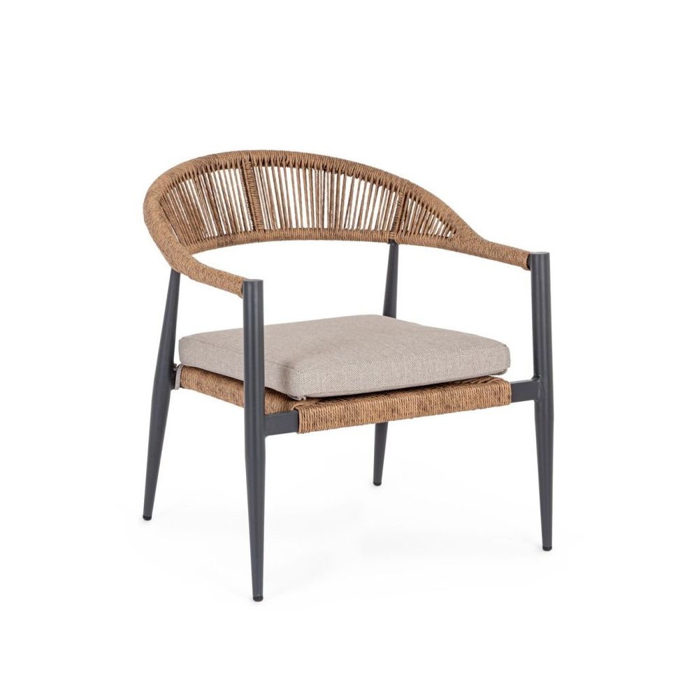 ALUMINIUM FRAME, POWDER COATED (POLYESTER), SYNTHETIC FIBRE WEAVING (TWISTED). CUSHION WITH WATER REPELLENT REMOVABLE POLYESTER FABRIC.