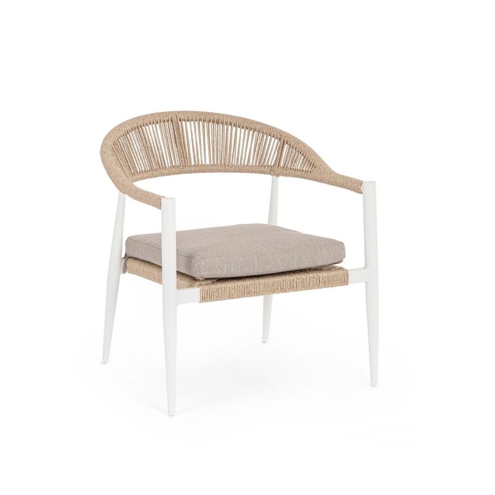 ALUMINIUM FRAME, POWDER COATED (POLYESTER), SYNTHETIC FIBRE WEAVING (TWISTED). CUSHION WITH WATER REPELLENT REMOVABLE POLYESTER FABRIC.