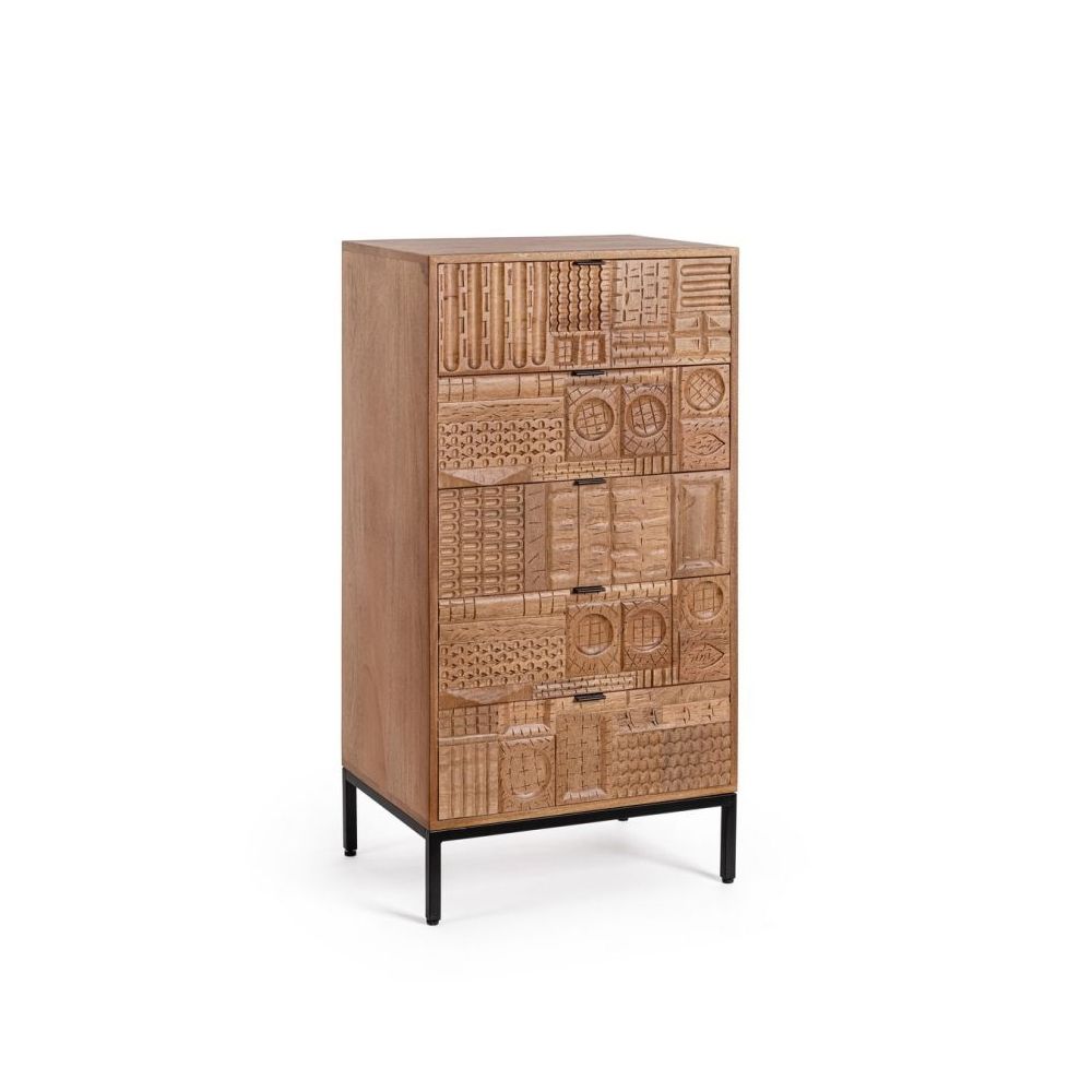 SOLID MANGO WOOD FRAME, MDF BACKREST. NITROCELLULOSE-BASED PAINT. STEEL LEGS AND HANDLES. FRONT DRAWERS AND DOORS INLAID AND HANDMADE. LEGS TO BE ASSEMBLED.