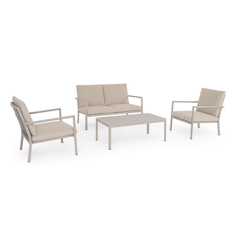 ALUMINIUM, POWDER COATED (POLYESTER) STRUCTURE. SEAT AND BACK IN TEXTILENE 1X1. REMOVABLE CUSHIONS WITH OLEFIN WATER REPELLENT FABRIC (100% POLYPROPYLENE). STAINLESS STEEL SCREWS.BACKRESTS AND COFFEE TABLE LEGS TO BE ASSEMBLED.