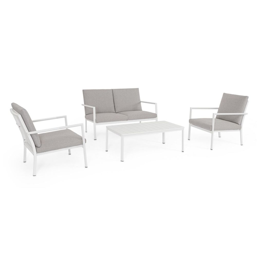 ALUMINIUM, POWDER COATED (POLYESTER) STRUCTURE. SEAT AND BACK IN TEXTILENE 1X1. REMOVABLE CUSHIONS WITH OLEFIN WATER REPELLENT FABRIC (100% POLYPROPYLENE.STAINLESS STEEL SCREWS BACKRESTS AND COFFEE TABLE LEGS TO BE ASSEMBLED.