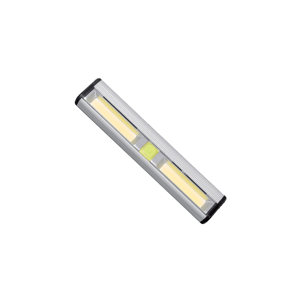 Aluminium LED light bar model E-4116 featuring a powerful 3W COB LED. Compact and practical (159x32x18 mm), in silver colour, with two magnets and a Velcro strip for easy attachment. Powered by 3 AAA batteries and equipped with a simple On/Off mode.