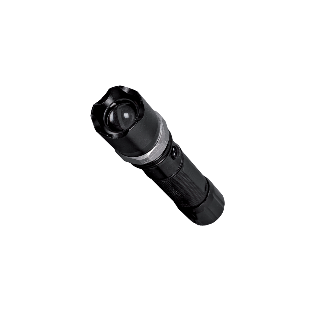 Flashlight model E1171 with CREE XPE LED type and 200 lumens brightness. Made of aluminum with a size of 150x33 mm. Offers 4 light modes: High, Low, Strobe, and Off. The zoom function provides a light distance of up to 250 meters on zoom-in and 100 meters on zoom-out. Powered by 3 AAA batteries and comes with a hand strap. Colour: black.