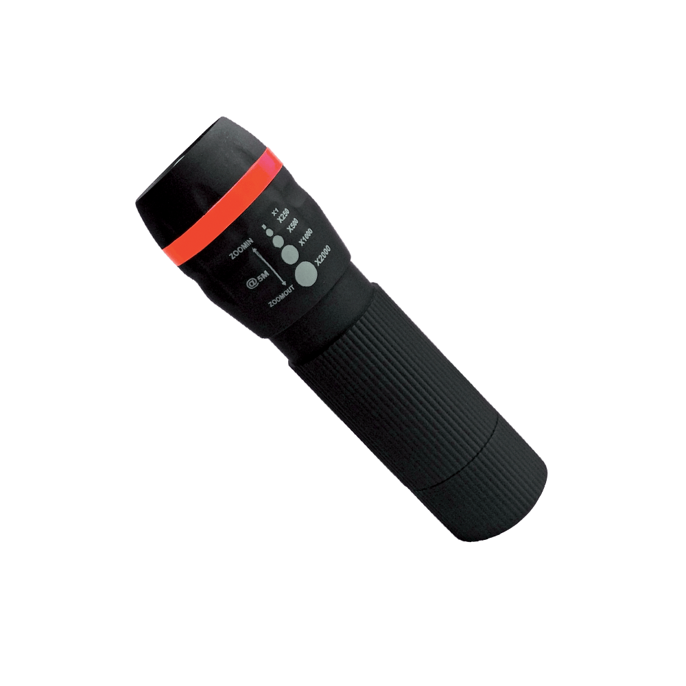 Zoom flashlight model E-6605 featuring a 1W LED and rubber-coated body for enhanced grip and durability. Compact size (115x34 mm), with telescopic zoom function and a convenient hand strap. Powered by 3 AAA batteries and equipped with a simple On/Off mode. Colour: black.