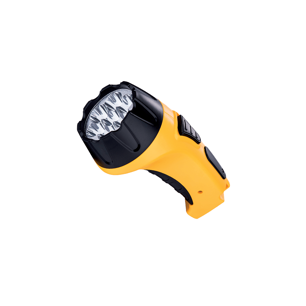 Handy spot flashlight model E-6630 featuring 7 LED lights, made of durable plastic in black and yellow. Compact and practical (150x70x70 mm), equipped with a built-in rechargeable battery and direct plug-in charging. Includes a simple On/Off mode.
