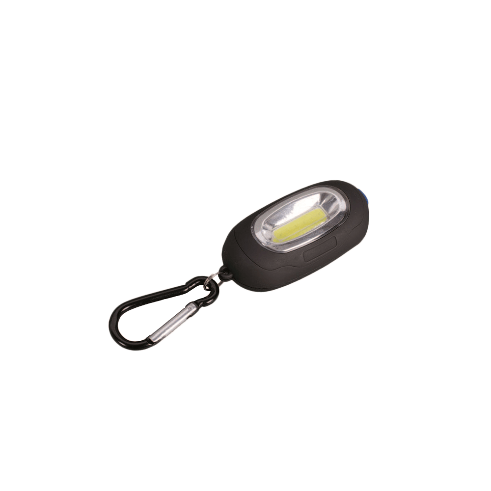Mini key light model E-5903 with 1.5W COB LED, made of plastic in blue colour. Compact size of 71x34x21 mm. Features a strong back magnet and a colourful carabiner for easy attachment. Powered by 2 CR2032 batteries, with light modes: High, Low, Flash, and Off.
