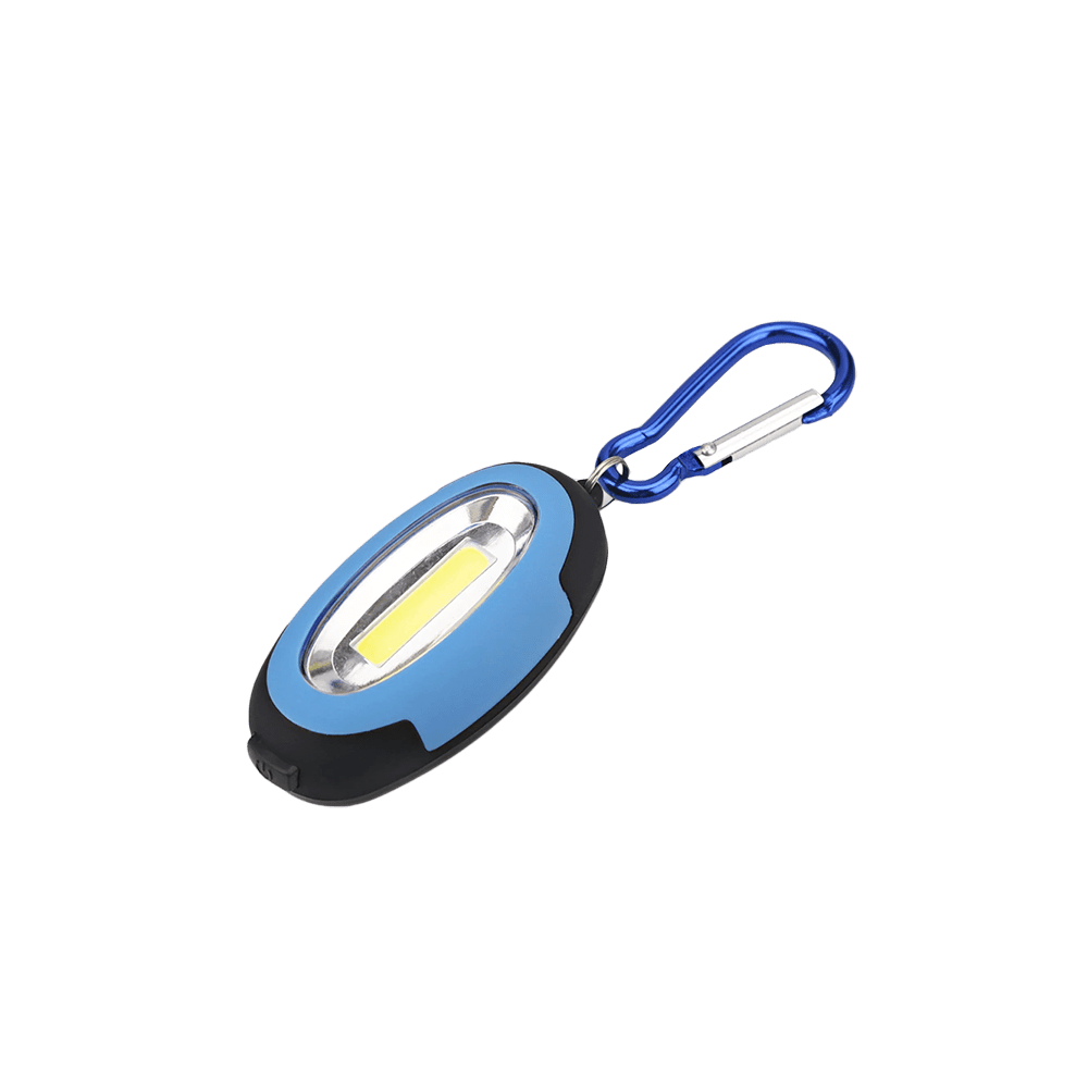 Mini key light model E-5903 with 1.5W COB LED, made of plastic in black colour. Compact size of 71x34x21 mm. Features a strong back magnet and a colourful carabiner for easy attachment. Powered by 2 CR2032 batteries, with light modes: High, Low, Flash, and Off.