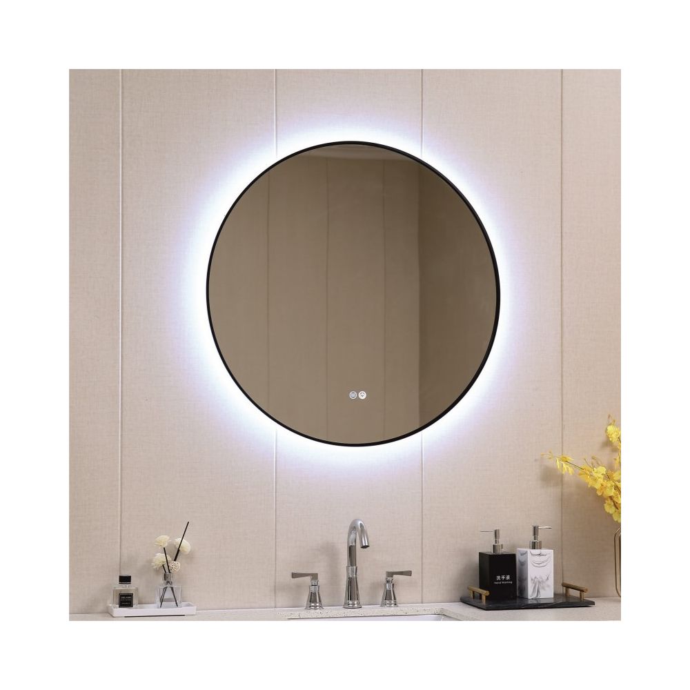 LED mirror D80CM with 3 color modes (3000K, 4000K, 6500K), anti-fog feature, dual round touch button, and black frame. Distance from Wall: 31mm