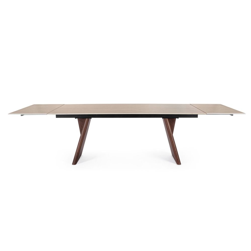 TOP IN PORCELAIN STONEWARE WITH MARBLE EFFECT.TOP SUPPORT IN EPOXY POWDER COATED STEEL. LEGS IN MDF VENEERED WALNUT WOOD. INDEPENDENT EXTENSIONS. ADJUSTABLE FEET. LEGS TO BE ASSEMBLED.