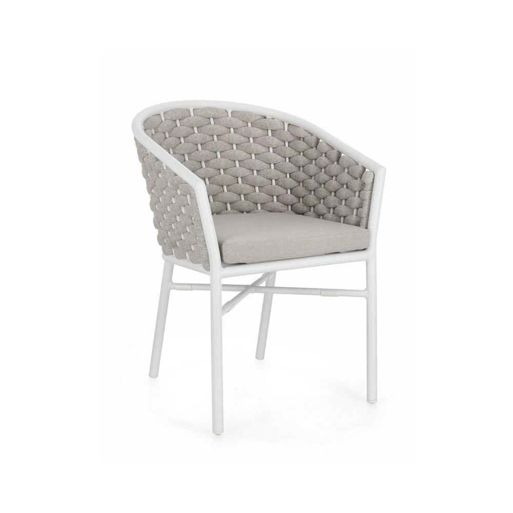 STRUCTURE IN POWDER COATED ALUMINIUM (POLYESTER). WEAVING FOR OUTDOOR USE IN POLYESTER ROPE PADDED IN RUBBER (POLYETHYLENE). REMOVABLE CUSHIONS IN 100% POLYESTER WATER-REPELLENT POLYESTER. STACKABLE. PACKAGING WITHOUT CARTON.