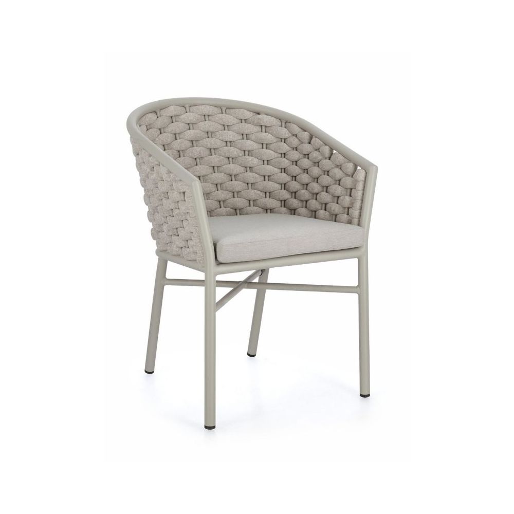 STRUCTURE IN POWDER COATED ALUMINIUM (POLYESTER). WEAVING FOR OUTDOOR USE IN POLYESTER ROPE PADDED IN RUBBER (POLYETHYLENE). REMOVABLE CUSHIONS IN 100% POLYESTER WATER-REPELLENT POLYESTER. STACKABLE. PACKAGING WITHOUT CARTON.